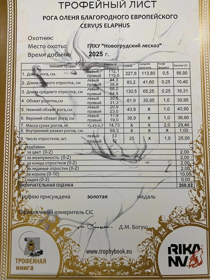 Два добытых им оленя оказались трофейными, получив золотые медали. Но самое главное – один из них, с результатом 268.82 балла, занимает почетное второе место в рейтинге Республики Беларусь, уступая лидеру из охотничьего хозяйства «Красный Бор» всего 4 балла.
